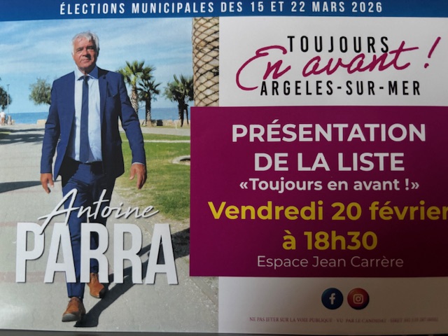 C’est ce vendredi 20 février, à 18H 30, qu’Antoine Parra, maire d’Argelès-sur-Mer, présentera sa liste “Toujours en avant!”, à 18H 30, à l’Espace Jean Carrère (Village).