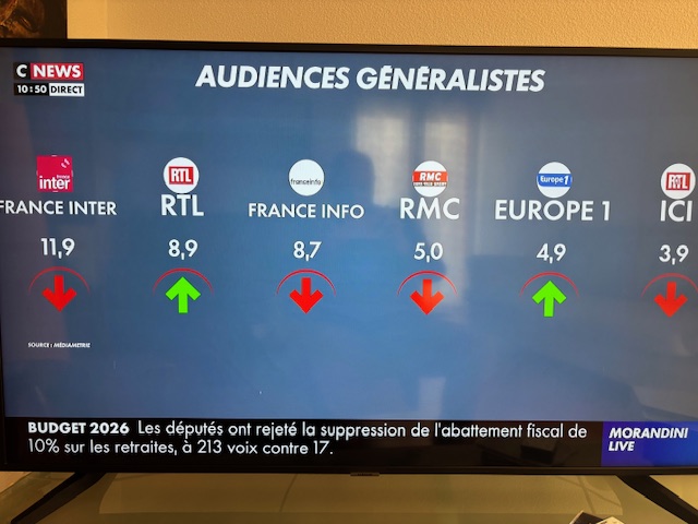 Hier, jeudi 13 novembre 2025, ont été publiées les audiences de la radio pour la période septembre-octobre 2025. Les résultats montrent d’importantes évolutions : jamais le média radio n’a été si peu écouté ! En l’espace d’un an, le média a égaré plus d’un million d’auditeurs. Alors qu’ils étaient encore plus de 40 millions il y a quatre ans à la même époque, leur nombre est tombé à 36,7 millions. Un plancher jamais atteint auparavant par la radio, depuis que ses audiences sont mesurées par Médiamétrie.