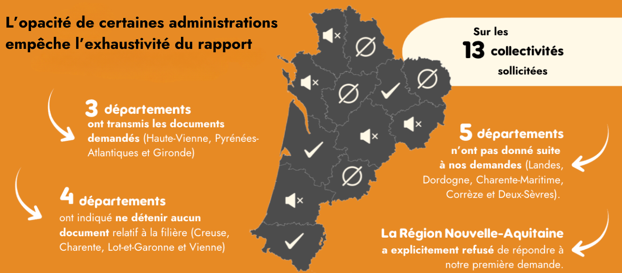 La Région Nouvelle-Aquitaine a explicitement refusé de transmettre les documents demandés, obligeant l’ObSAF à s’appuyer uniquement sur les délibérations et annexes mises en ligne. Dans d’autres départements (Landes, Dordogne, Charente-Maritime, Corrèze, Deux-Sèvres), les demandes sont restées sans réponse.
