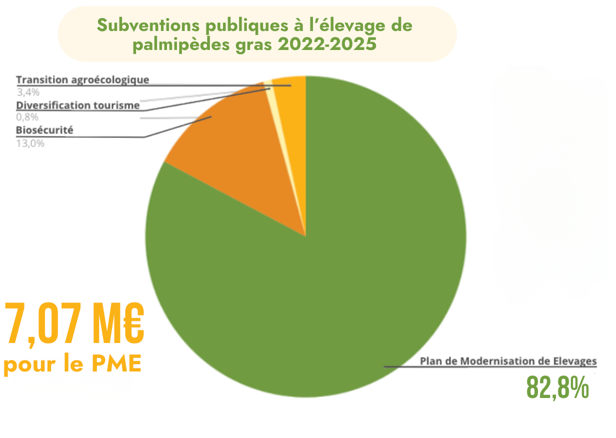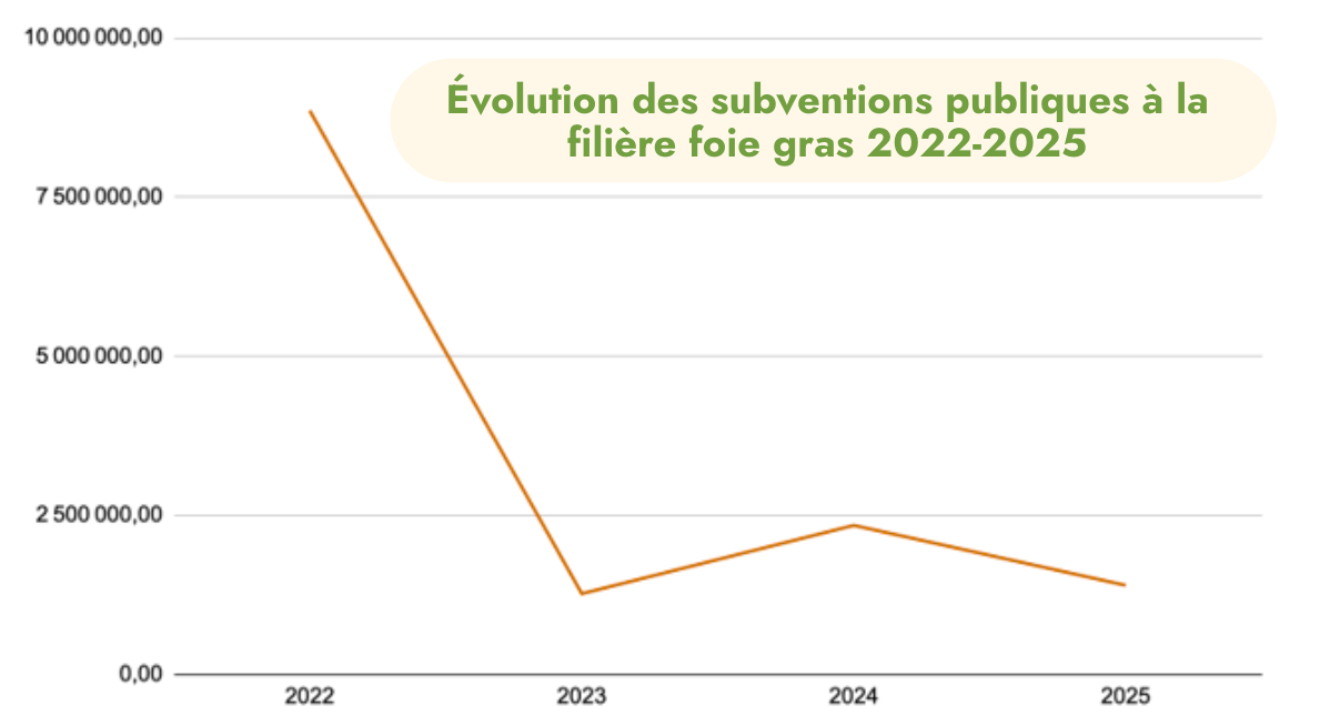 Entre 2022 et 2025, l’ObSAF a identifié 13,8 millions d’euros d’aides publiques versées à la filière foie gras. Le montant réel est sans doute plus élevé, plusieurs administrations n’ayant pas transmis l’ensemble des documents demandés.