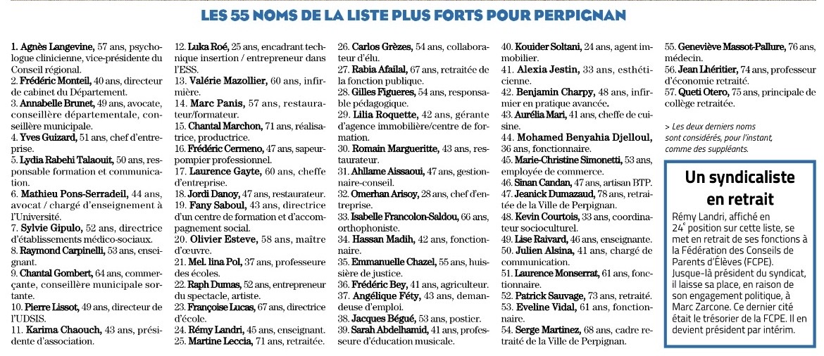*Ci-dessous, la liste complète conduite par Agnès Langevine-Codognès pour les élections municipales des 15 & 22 mars prochains sur Perpignan, publiée ce samedi 21 février 2026 par la rédaction du journal L’Indépendant.