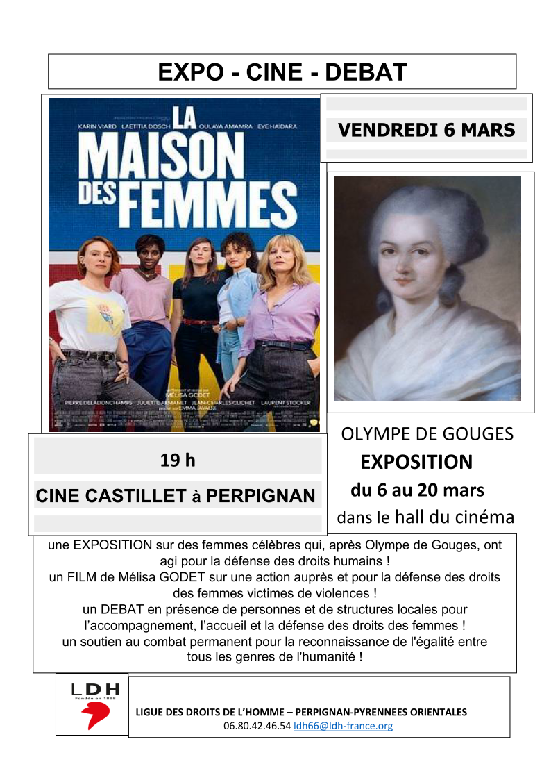 A l’occasion des Semaines des Droits des Femmes 2026 coordonnées par le Conseil Départemental 66, le vendredi 6 mars, à 19H,  expo-ciné-débat en partenariat avec le ciné Castillet de Perpignan : avec le film “La Maison des Femmes” de Melisa Godet, et l’exposition “Olympe de Gouges, portraits de femmes, un combat”, accrochée dès le 4 mars (jour de la sortie du film) dans le hall du Ciné Castillet.