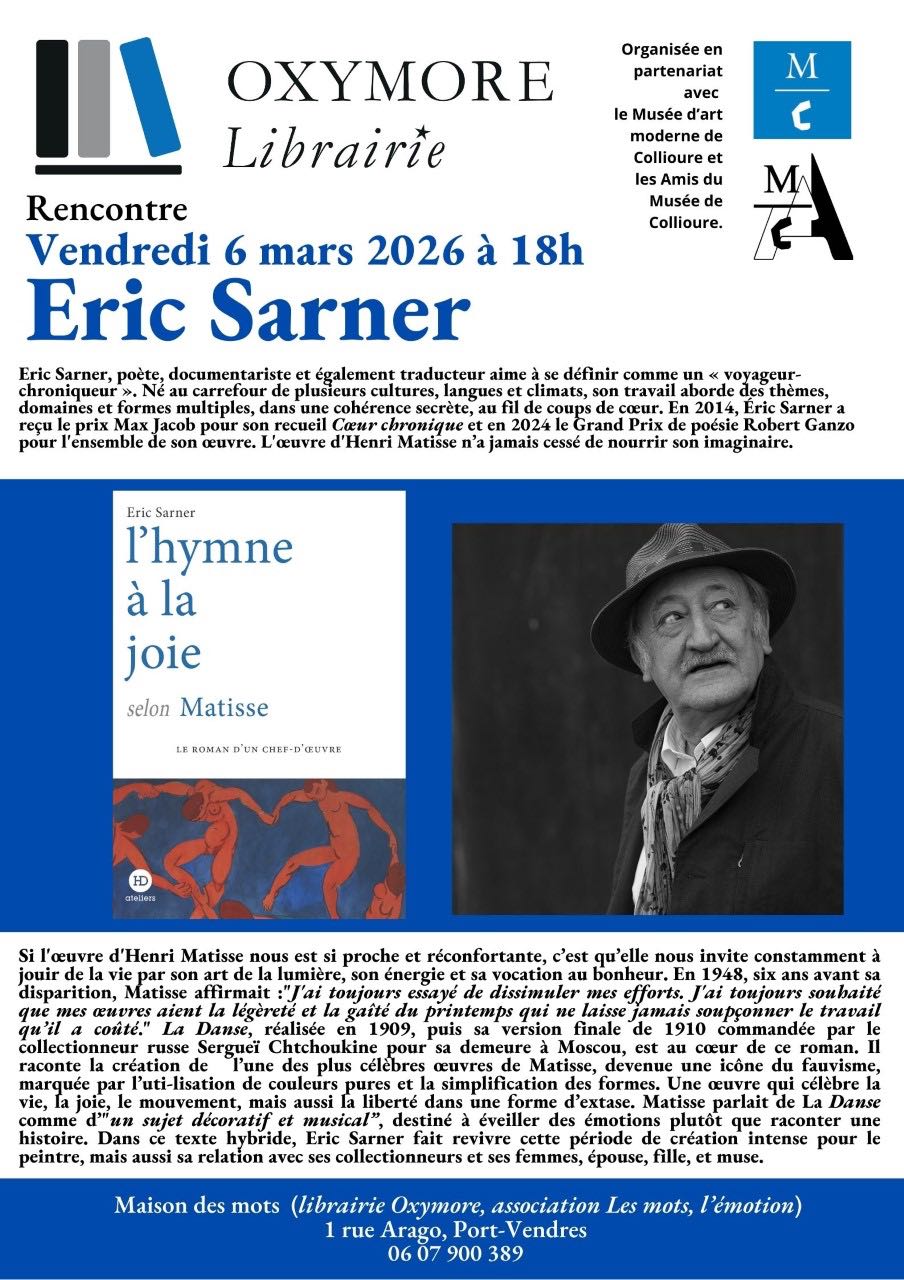 • Port-Vendres/ Vendredi 6 mars, 18H : rencontre autour de Matisse avec le poète et documentaliste Eric Sarner, à la librairie Oxymore